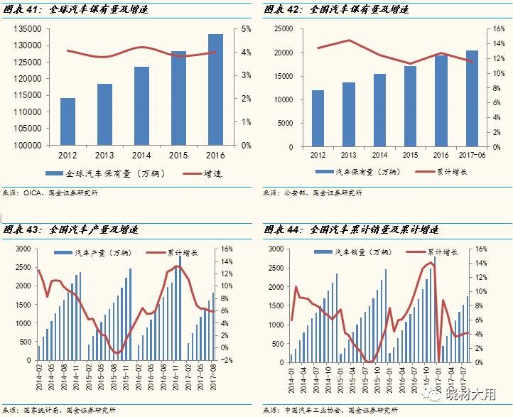 国内方面,国内汽车行业景气度于2015年年中止跌回升,各月份累计增长率呈快速上升状态,2016年全年汽车总产量、总销量分别为2819.31万辆、2802.82万辆,同比增速分别为13.10%、13.65%。虽然17年前8个月汽车产量、销量分别为1818.10万辆、1751.11万辆,累计增长率5.90%、4.25%,较16年增速有所下滑,但仍保持稳定增长状态预计全年产销量相比上年仍有一定程度增加,增幅在5%-10%。近年国内汽车保有量增速稳定在11-13%之间,截止2017年6月全国汽车保有量20500万辆,同比增长11.64%。
