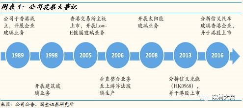 信义玻璃于1989年成立于香港,2005年公司于香港交易所上市。公司产品涵盖优质浮法玻璃、汽车玻璃、建筑节能玻璃及超薄电子玻璃产品等领域。国内生产基地遍布中国经济发展最活跃的珠三角、长三角、京津冀、西部成渝经济带。二十九年来公司经过长足的发展,目前已成为全球玻璃产业链的主要制造商之一,亦是中国第一大浮法玻璃生产商。