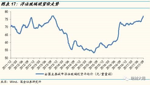 供需格局改善,玻璃价格高位企稳。随着供给收缩,供需格局改善,玻璃价格也实现淡季高开高走,截止17年9月15日,全国主要城市浮法玻璃现货平均价为77.2元/重量箱,与16年年末平均价72.4元/重量箱相比上涨6.63%,创造近四年最高水平。由于玻璃生产企业众多,并且产品差异小、竞争激烈,行业集中度很低,对下游房地产商、汽车制造商的议价能力较弱,因此价格走势主要取决于供需状况。就目前玻璃市场的供需格局来看,供应端新增生产线较少,在产产能暂时维持较稳定状态;需求端房地产、汽车行业景气度良好,需求保持稳定增长,预计玻璃价格短期内有望持续高位,企业盈利水平持续改善,若后市前期冷修线加快复产速度,价格或承压。