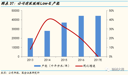 公司是中国最大的建筑节能玻璃制造商之一,占中国节能玻璃市场约18%-20%的份额。主要生产低辐射镀膜玻璃(LOW-E玻璃)、热反射镀膜玻璃、中空玻璃、钢化玻璃、夹层玻璃、彩釉玻璃等高档节能玻璃产品。目前信义玻璃为国内外大中城市标志性建筑提供高质量的建筑节能玻璃产品,如上海世博会中国馆、世界大运会主场馆、三亚美丽之冠七星大酒店、日本新东京塔等。2013-16年公司建筑玻璃Low-E产能由2000万平米/年上升至4415万平方米/年,年复合增速高达30.2%,规模优势明显。