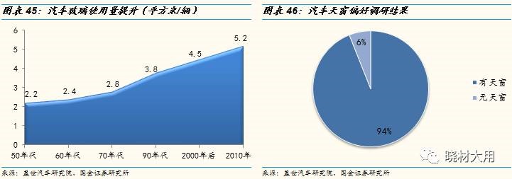 消费升级,汽车玻璃使用量逐年增加。汽车玻璃消费量还受到使用者消费偏好影响,使用者对消费体验及功能需求的增加也是汽车玻璃需求提升的重要助推因素,如天窗及前挡风玻璃倾斜度增加可扩大视野,优化驾驶体验,同时增加玻璃使用量。根据盖世汽车研究院统计,每车玻璃用量在过去10年间以1.4%的增速增长,调研显示94%的受访者在未来购车时会偏向有天窗车型,未来每车玻璃使用量有望继续提升。