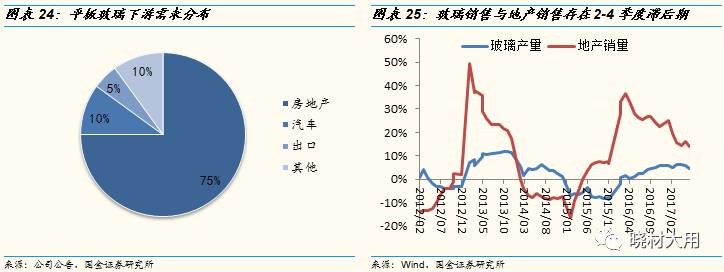 从下游需求来看,房地产是平板玻璃的主要应用领域,占总需求的75%左右,主要应用于门窗、幕墙、家具等装饰用品,其次是汽车领域和出口,占比分别约10%和5%。由于玻璃与房地产行业相关程度非常高,所以玻璃销售与地产共周期,但玻璃销售与地产新开工有2-4个季度的滞后期。