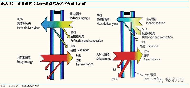 节能玻璃:随绿色城市兴起,成长空间巨大。Low-E玻璃(即低辐射玻璃)是一种较主流的节能玻璃,具有优异的热性能和光学性能,用于制作建筑门窗,在冬季能够比普通玻璃减少约40%通过门窗传导的热损失,从而节约能源消耗;此外,Low-E玻璃对直射太阳能的穿透率从84%降至65%,能够改善建筑内的温度和光照环境。