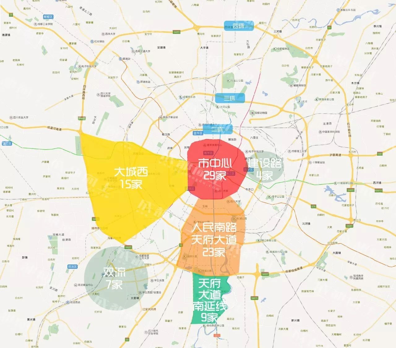 事实上, “ 星巴克算法 ” 不仅仅存在于城际间,也存在于一个城市中的各个区域。UP君就以成都的108家门店来举例说明(这可能是全成都最新的数据了,因为这是UP君在星巴克官网一家一家数出来的)。