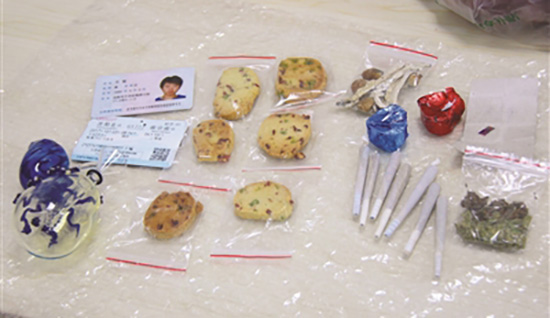 10日傍晚6点多,南京南火车站派出所民警耿振宇在车站到达层巡逻时,发现一名年轻男子站在麦当劳餐厅门口,耳朵里塞着耳机听着歌,不时地抬头四处张望似乎在等人。此人身材干瘦,面色蜡黄,有点像长期吸毒的状态,看见民警走过来,他立马低下了头,双腿有些微微颤抖,一只手插在鼓起的牛仔裤口袋内,在他身上背的双肩背包上居然印着一枚貌似麻叶的图案。民警立即警觉起来,将该男子带回派出所进行盘问检查。果然,民警在该男子的牛仔裤口袋内查获一只香烟盒,里面装有七支卷好的大麻烟。最终民警当场查获伪装成巧克力、曲奇饼干的新型毒品、“致幻蘑菇”32克、“大麻”70.8克及“邮票”0.02克。