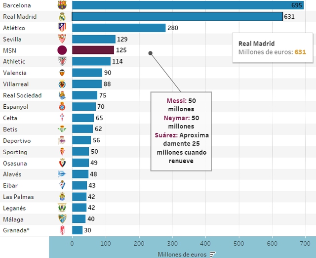 薪水方面,巴萨球员在上赛季的收入占球队总额的66%,同样没有超过章程规定的70%的极限。而《马卡报》的数据显示,单单梅西、内马尔、苏亚雷斯三人的年薪支出,就达到了惊人的1.25亿欧元。在西甲的20支球队中,MSN的工资总额甚至高于16支球队的在上赛季的预算,只低于皇马、马竞、塞维利亚以及巴萨自己。
