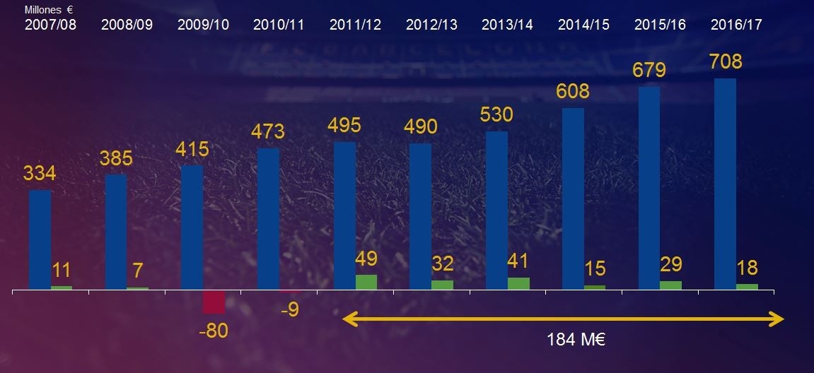事实上,巴萨的收入已经实现了连续4个财年的持续上升。从2011-12赛季至今,球队的税后净收入总计达到1.84亿欧元。