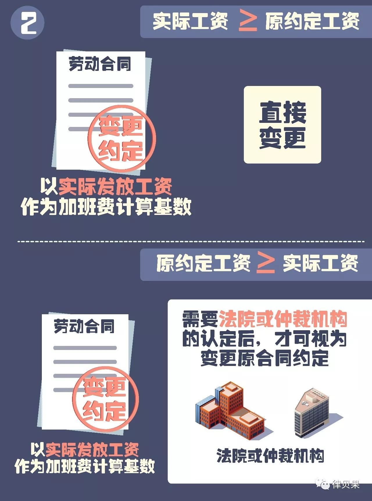 (2)当实际工资≥原约定工资,视为双方变更原合同约定,以实际发放工资作为加班费计算基数;当原约定工资≥实际工资,如果能认定双方变更原合同约定,以实际发放工资作为加班费计算基数。