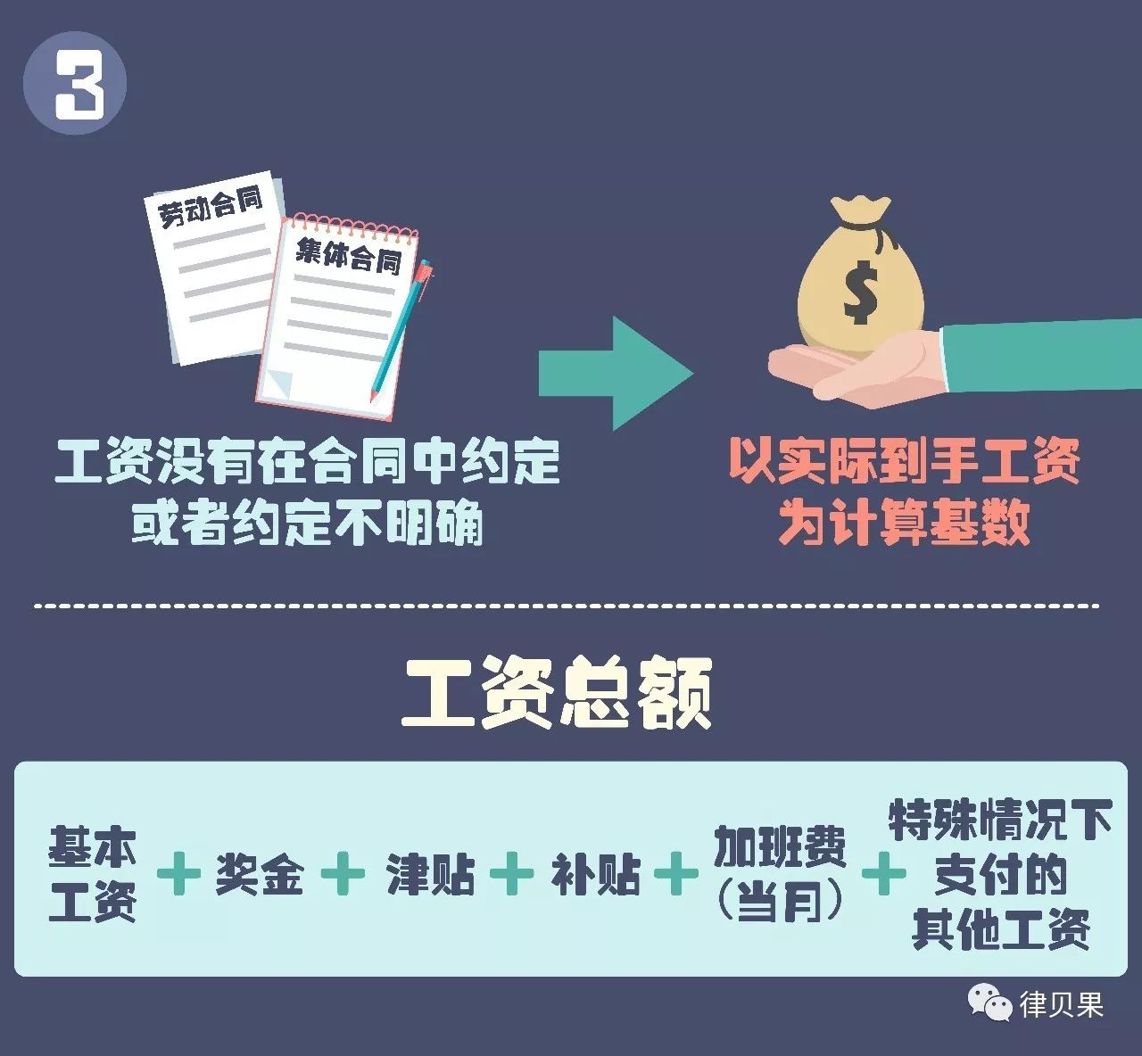 (3)对于工资,没有在合同中约定或者约定不明确的,以实际到手工资为计算基数。一般来说,工资总额=基本工资+奖金+津贴+补贴+加班费(当月)+特殊情况下支付的其他工资,单位不能以其中任何一项单独作为计算基数。当然,在以实际到手工资作为加班工资计算基数时,应当扣除前月加班费、餐补等费用。