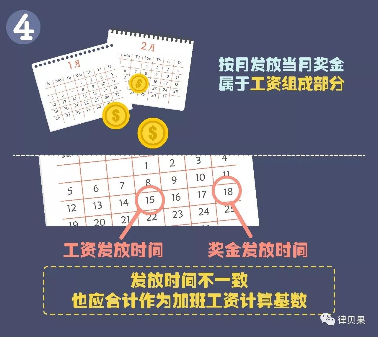 (4)按月发放当月奖金,属于工资组成部分,即使发放日期与当月工资不一致,也应合计作为加班工资计算基数。而不按月、季发放的奖金,则要看实际情况来判断是否合计作为加班工资计算基数。