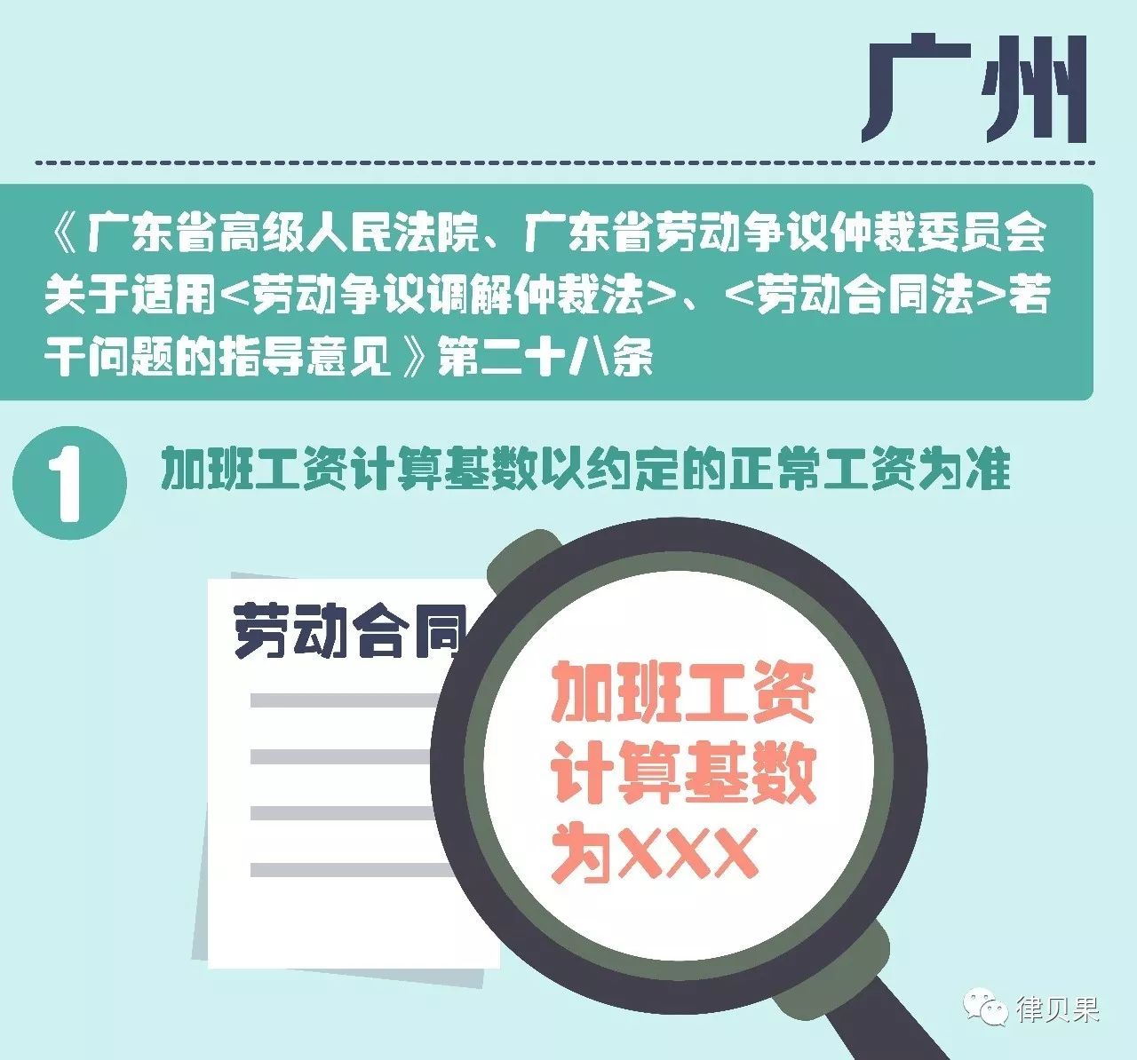 对于广州的加班工资计算基数规定在《广东省高级人民法院、广东省劳动争议仲裁委员会关于适用<劳动争议调解仲裁法>、<劳动合同法>若干问题的指导意见》第二十八条。该指导意见说了三件事儿,