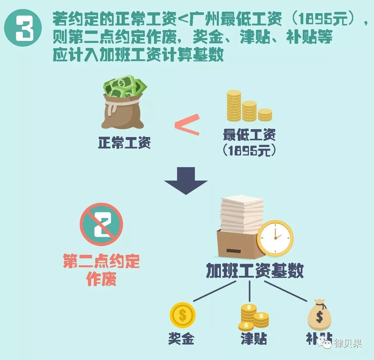 第三,如果约定的正常工资广州最低工资(1895元),则第二点约定作废,奖金、津贴、补贴等应计入加班工资计算基数。