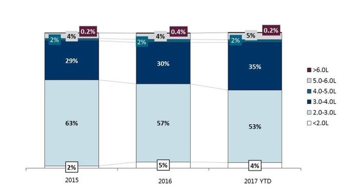 从平行进口车的排量结构来看,大排量盛行,2.0-4.0升份额接近九成,其中2.0-3.0升是第一大区间,份额超过五成。