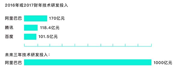 10月11日,阿里巴巴在杭州云栖大会上宣布成立 “达摩院”,进行基础科学和颠覆式技术创新研究,3年投资1000亿元。财报显示,阿里2017财年技术投入为170亿元,已经超过百度同期的101.5亿、腾讯118亿和京东54亿,居中国互联网公司之首。