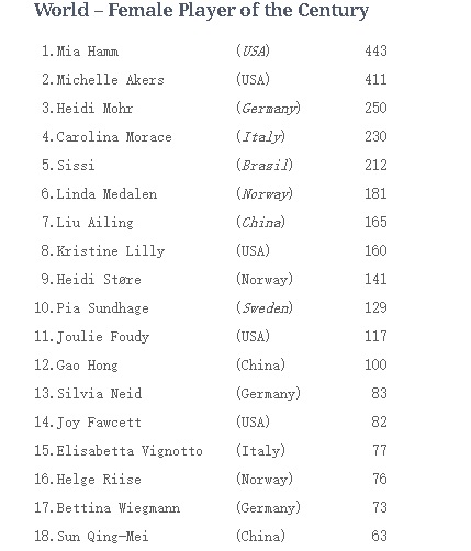 在女足方面,美国传奇球员米亚·哈姆当选最佳女足球员,美国人阿克斯、德国人摩尔排名2、3位。中国女足球员共有四人入围该榜单,刘爱玲排名第7,高红排名第12,孙庆梅排名第18,范运杰排名第26。