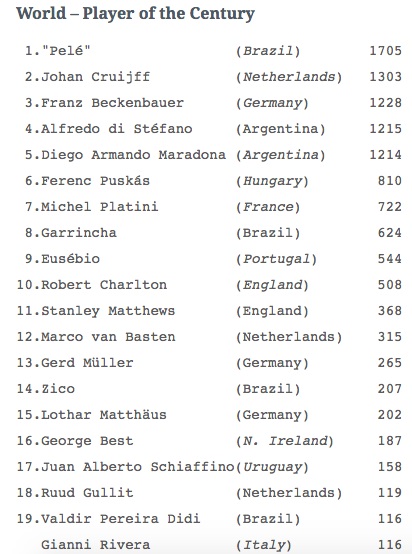 男足方面,巴西球王贝利当选最佳男足球员。克鲁伊夫、贝肯鲍尔、迪斯蒂法诺、马拉多纳分列2至4位。