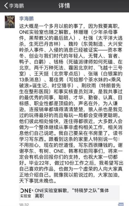 遗憾的是,ONE实验室微信公众号自7月20号发布了这个好消息后,便再无更新。近日,李海鹏在朋友圈发了一段文字,确认“ONE实验室”解散,而他本人也将离职。