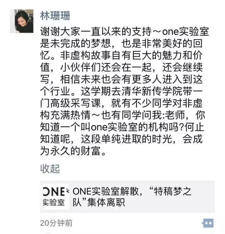 “ONE实验室是未完成的梦想,也是非常美好的回忆。”作为“ONE实验室”的负责人,林珊珊也在朋友圈留下自己的感想,还表示,“非虚构故事自有巨大的价值和魅力,小伙伴们还会在一起,还会继续写。”