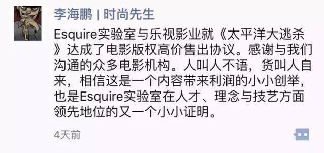 “ONE实验室”团队作者杜强早前被乐视影业以百万价格买入的《太平洋大逃杀》,是杜强在《时尚先生Esquire》时期的作品,取材于2010年底“鲁荣渔2682号”渔船上11名船员杀害另外22名船员的真实命案。这篇文章在微信平台的总阅读量高达3000万+,新浪微博评论10万+,当初赢得了阿里、博纳、乐视等数十家影视机构的购买意向。