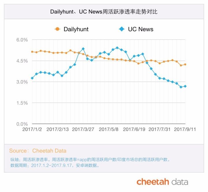 排名前两位的Dailyhunt和UC News竞争态势一直比较激烈。整体上来看,Dailyhunt近半年来有下滑趋势,而UC News起伏比较大,在今年上半年不断在缩小和Dailyhunt之间的差距,五六月份周活跃渗透率一度超越了Dailyhunt,但近期又有下降,差距再次被拉开。