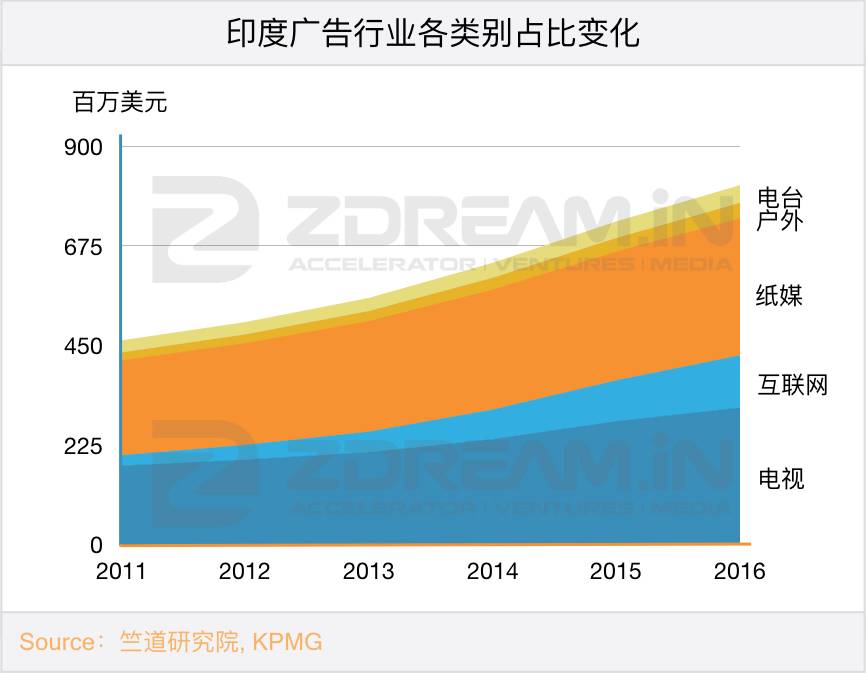 毕马威2017年关于印度文娱行业的一份报告显示,以TV、纸媒、电影为代表的传统文娱媒介仍然占据着整个娱乐产业的大头。从市场规模来看,TV占据46%,纸媒占24%,电影占11%;从广告份额上看,印度TV、纸媒的广告份额各占38%、广播占5%左右,这种分布接近中国2005年左右的情况。