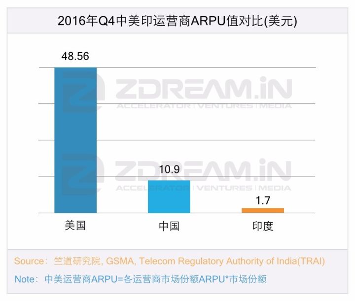 受限于印度较低的人均可支配收入与尚未形成的付费观念,印度运营商ARPU(每用户平均收入)值约为2美元,即使在发展中国家也处于相当落后的位置,还不到中国的1/5。