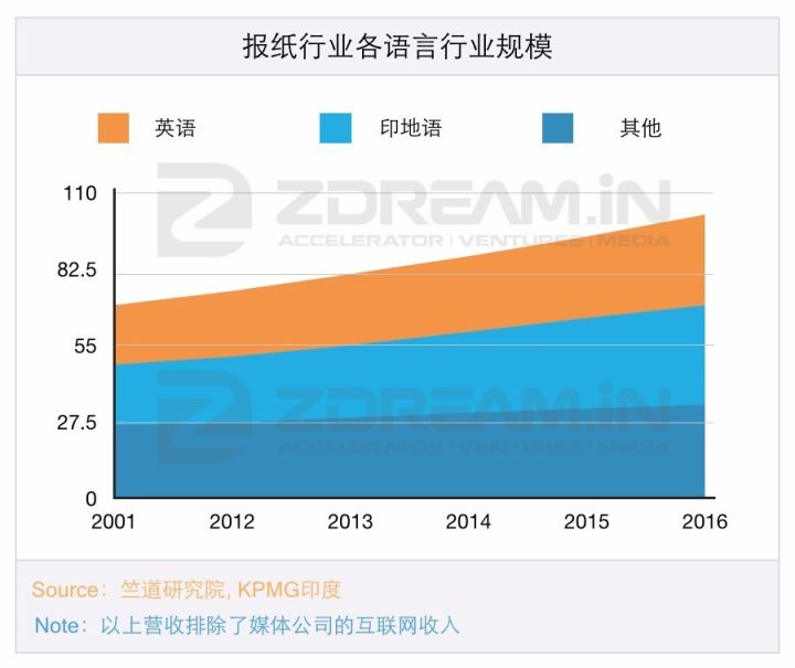 纸媒业目前占据着印度文娱市场约四分之一的规模。在全球报业遇冷的大环境下,印度报业却呈现出逆势繁荣的景象,行业规模年增速在7%左右。得益于印度的高人口密度与碎片化语言,未来印度整体报业仍将呈现一定的增长态势。
