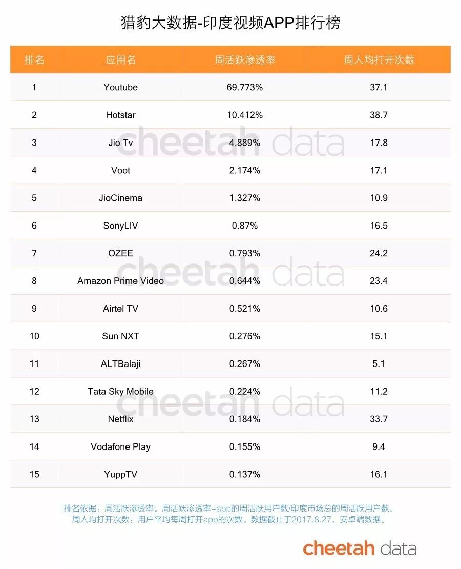 Youtube是印度视频app市场的绝对霸主,排名第二的hotstar周活相当于Youtube的六分之一,而hotstar也独占视频app的第二梯队,周活领先第三名两倍多。