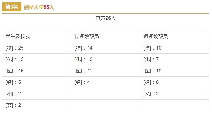 代号:[物] 物理学;[化] 化学;[医] 生理学或医学;[文] 文学;[和] 和平;[经] 经济学。