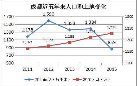 从下图看,过去五年来,成都人口持续增加,2015年成都常住人口增加17万人。相反,住宅竣工面积整体呈下降趋势,尤其2015年明显下降。巧合的是2016年成都房价开始上涨。人口增加带来的需求增加,土地减少带来的供给减少。所以过去一年房价自然会上涨。