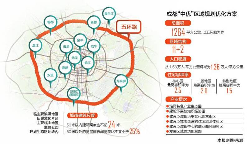 中优就是中心城区优化。中优的范围是五环以内,面积共1264平方公里。五环位于绕城高速和第二绕城高速之间,包括成都中心城区和温江、郫县、新都等二圈层区域的一部分。