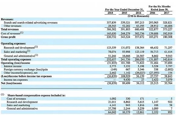 业绩方面,招股书显示2014年、2015年、2016年搜狗总营收依次为3.8亿美元、5.9亿美元、6.6亿美元。其中搜索和搜索相关广告营收分别为3.58亿美元、5.40亿美元和5.97亿美元,其它营收分别为2850万美元、5230万美元和6320万美元。
