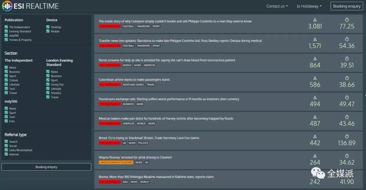 代理商们可以访问名为ESI RealTime的工具,它所抓取的数据覆盖了ESI旗下的各大媒体品牌,包括indy100(《独立报》旗下媒体)和Homes & Property(《标准晚报》旗下媒体)。ESI RealTime会利用流量分析网站Chartbeat的数据,展示文章实时访问量、用户停留时间等传媒业沿用许久的数据指标。