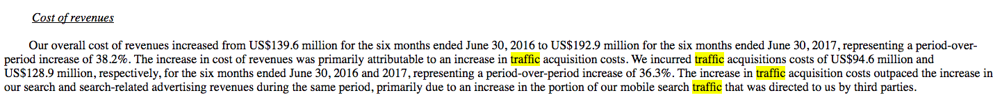 而搜狗也在招股书中说了,上半年营收成本是1.3亿,今年上半年营收成本是1.9亿,而这些钱,绝大多数都花在了流量购买上。其中去年花了0.94亿,今年花了1.2亿,现在流量采购的费用,已经水涨船高了,所以搜狗在招股书开头的风险提示里,也提到了流量采购成本的问题。