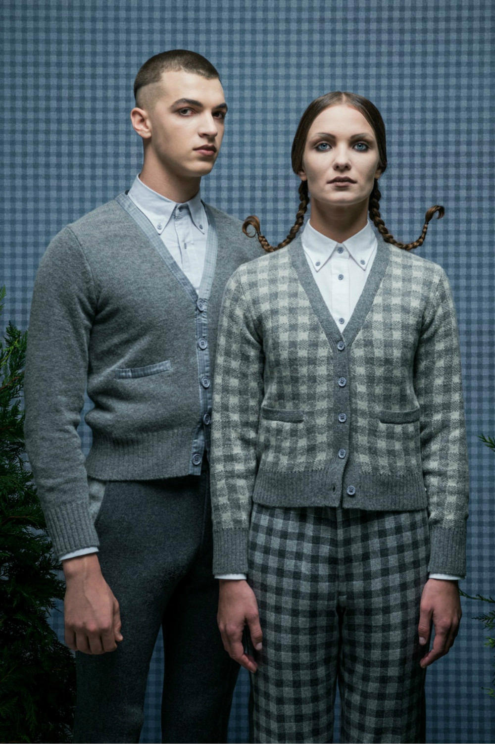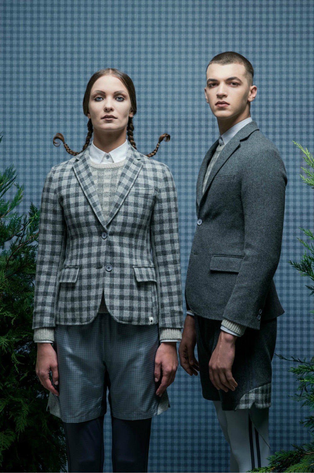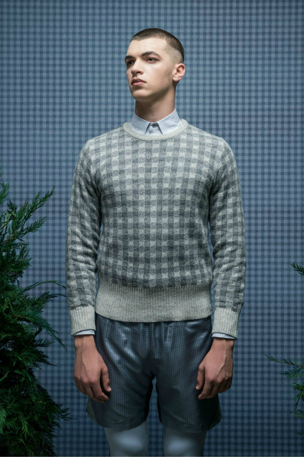 以小动物为主题的KOE x Thom Browne系列出现在上一个季节,现在是秋天,日本时尚品牌KOE 与Thom Browne联乘系列于是以”Winter Running“为主题,风格也更加成熟厚重。新系列的男女装版型相似,仅在裁剪上作出区分,款式一如既往地简约,包括毛衣、坎肩、羊毛开衫、英伦校园风西服外套和直身风衣等。这一秋冬系列选用保暖的羊毛织物为主要材料,用修身设计中和了笨拙感,配色上以灰色调为主,配以格纹图案设计。
