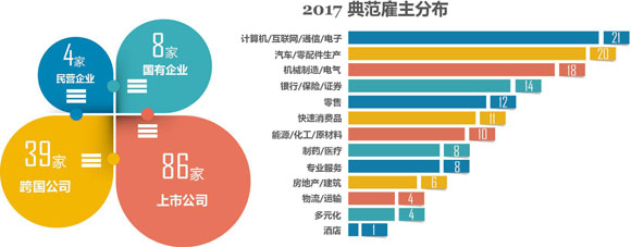 10月12日,前程无忧公布了2017中国典范雇主榜,包括微软、百度、腾讯、3M、宜家、优衣库等137家企业入选。其中有86家上市公司,39家非上市跨国公司,以及4家民营企业和8家国有企业。