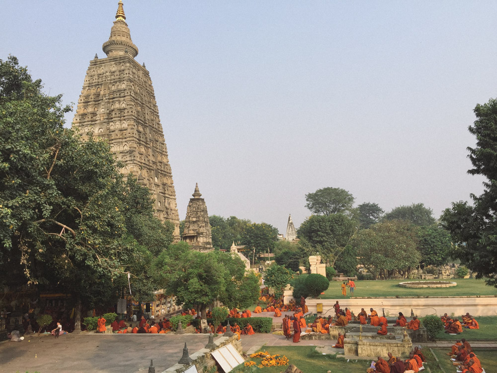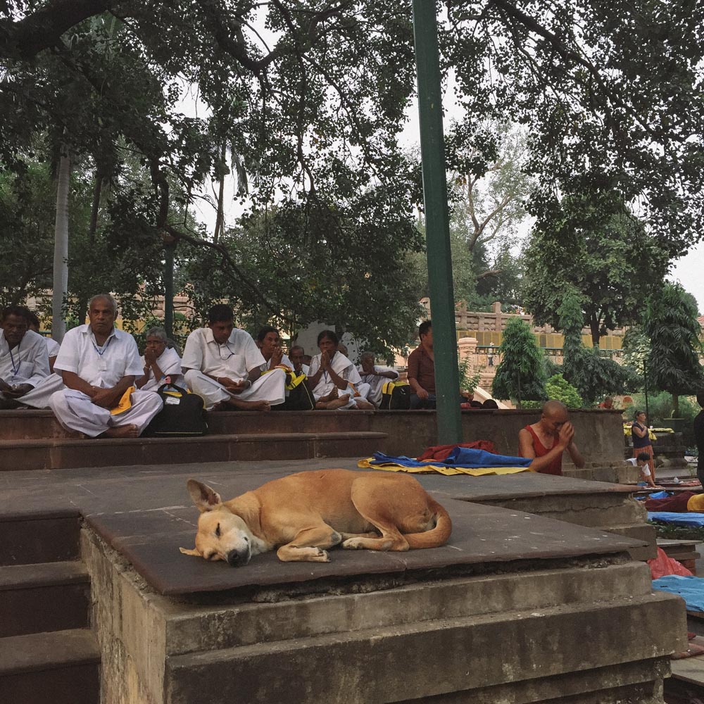 菩提伽耶是个小城,一条主路连接起街市与摩诃菩提寺,街市上三轮车的突突声和寺庙里供奉的香灯都永不停歇。寺庙的院墙是世俗与灵性,也是喧闹与清净的分界线。正值悉达多节,每天都有大量人群在墙内外做着钟摆运动。摩诃菩提寺是世界文化遗产,最核心的区域是一大片下沉的佛塔区,正中有两棵大菩提树,传说悉达多正是在其中一棵下面证悟成佛。