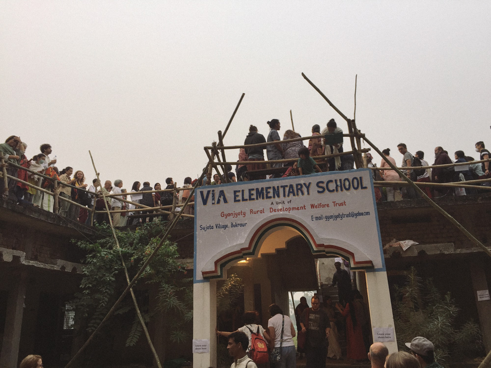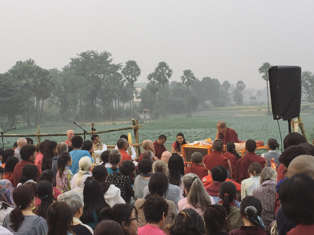 二楼楼顶视野很好,远处一片灰绿色的田野和一排高树,偶尔有大鸟飞过,雾霾在此刻并不让人烦恼,反而增加了某种灵性,按照传说,这就是悉达多证悟之前遇到牧羊女苏嘉塔,被羊乳供养恢复体力、也恢复了和世界的联结的地方。那是一个让人沉静的下午,某些时刻我甚至能感到有种能量在流动。但这毕竟是印度,开示到尾声,附近村庄传来了欢快的印度摇滚,大家面面相觑地笑了。