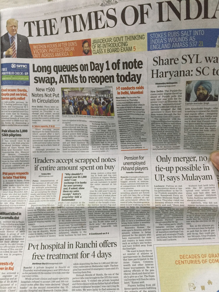 早晨起来,太阳彻底失去了光芒,几乎可以用肉眼直视。不只是新德里,整个印度东北部都陷入了重霾的包围——我所在的那10天,在“air matters”的全球空气城市排行榜上,瓦拉纳西和中国河北的辛集一直在争夺头把交椅。不过更大的新闻是,印度总理昨晚宣布,为了打击逃税和贪腐,即刻废除500和1000的大面额卢比。起床看到新闻时,我终于想起了昨晚的ATM意味着什么,在这个早上,菩提伽耶(大概全印度也是如此)所有的银行和ATM机都闭门谢客。