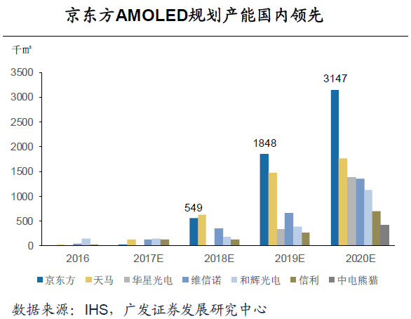 京东方A同样投资465亿元的绵阳第6代柔性AMOLED生产线在建之中,预计将于2019年实现量产。广发证券认为该生产线投产后将奠定京东方在柔性AMOLED领域的领先地位。京东方A也有望借此技术率先进军曲面、可折叠显示产品。