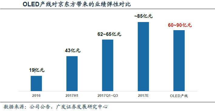 广发证券认为,OLED生产线带来的业绩弹性很大。该机构预估,成都生产线在60%-65%的良率水平上能够实现的年净利润大约是60亿-90亿元。2016年京东方A全年净利润不到19亿元,在2017年LCD面板行业保持景气的情况下,公司前三季度净利润约为62亿-65亿元,因此,预计全年净利润为85亿元左右。