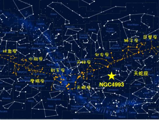 对于哈勃常数的测量,这次使用了“可能的” 宿主星系的信息。 为什么是可能呢?因为我们只是根据空间方位的信息,就“锁定”了宿主星 NGC4993。 然后我们就由光学观测所给出的NGC4993的退行速度
