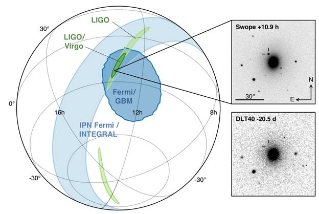 绿色的轮廓是引力波探测对GW170817在天空中的定位(浅绿色的两个轮廓是LIGO的定位范围,而深绿色的轮廓是加入Virgo以后的定位范围),蓝色轮廓是伽马射线探测器对GRB170817A的定位。标有Swope的灰色插图是光学望远镜对SSS17a的定位,而标有DLT40的灰色插图是在事件前的对照,上面灰色图多出的小点是SSS17a,而两者都有的大黑点是NGC4993星系。