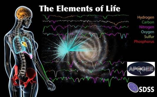 根据现在的理论,在大爆炸初期,宇宙的温度很高,充满了热辐射(“要有光!”)。当宇宙不断的膨胀,温度就会降低,从热辐射中就会逐渐形成一些质量比较小的粒子,如正负电子,再以后,会形成质子和中子。质子本身就是氢原子核的一种。当温度不断下降,这些质子和中子会通过核反应,“凝结”成更重的元素,比如氦和锂,还有氢的另外两个同位素,氘和氚。可是,核反应不光和温度有关,也和各个成分的浓度有关。根据现在的理论,早期宇宙降温和膨胀的过程很快,来不及产生比锂更重的元素。那么,构成和支持生命的碳、氧、氮、硫、磷、钙、钠等等这些元素,都是从哪里来的呢?这要从太阳为什么会发光开始。