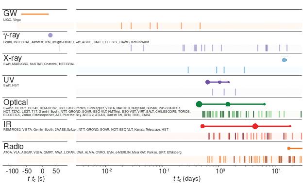 在后续的几个星期里,天文学家们利用其他位于地面、空间和地下的天文观测站,在电磁波的各个波段 (从伽马射线、X光、紫外,红外,可见光,微波),以及利用中微子探测技术,对这个已经由三个独立运行的引力波观测站 (LIGO Hanford, LIGO Livingston和Virgo)、伽马射线,和可见光都探测到的天文事件进行了进一步详细的研究。