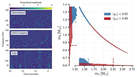 从引力波的波形,我们可以测量两个星体的质量和自旋。不加入对星体自旋(即旋转)的假设,那么我们对质量的测量结果在0.86到2.26太阳质量之间,虽然和中子星一致,但是也不能完全排除黑洞的可能性,或者是我们前面讨论的其他星体。如果假设这两个物体的自旋跟中子星的量级一致,则得到质量在1.17到1.60太阳质量之间,跟已经观测到的脉冲双星里面中子星的质量非常一致。