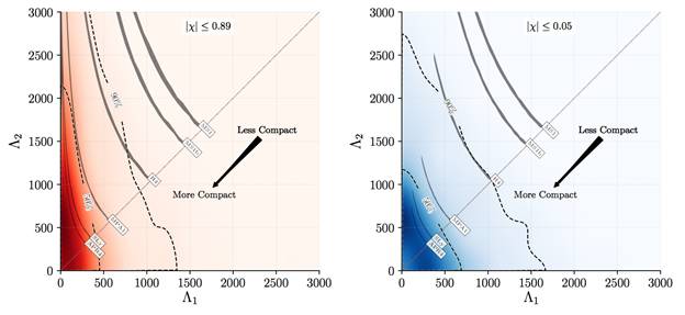 想要通过引力波细致研究星体的内部结构,就要看双星之间的潮汐作用对引力波的影响。月亮和太阳可以在地球上引起潮汐,让地球不同位置上海面的高度周期性的变化。双星中星体之间的引力场,也会引起它们各自的形变,而这个形变的大小,会依赖于星体的内部结构。潮汐导致的形变,会影响双星发出的引力波波形的细节,尤其是在引力波的高频部分。在这次的事件中,我们没有检测到中子星的潮汐形变,只是对形变系数设定了上限。这个上线,已经可以排除一些现有的中子星结构模型。