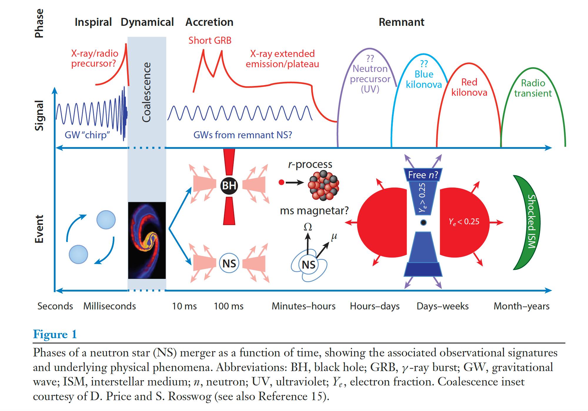 具体的说,两个中子星并合之后,理论预言有三个可能演化途径,一个是直接变成了黑洞,另外一个是因为旋转能等作用,会有一个磁性中子星存活一段时间(小于约100毫秒),然后再变成了黑洞,还有一个可能是并合后的中子星质量比小,中子星一直存在。无论如果,这个碰撞过程会抛射出物质,大家也相信中间核心天体周围形成一个吸积盘。这些抛出的物质发生r-过程(产生了我们需要的金子!),这些物质还和周围星际介质发生相互作用产生。当然,天文学家看到是短伽马射线暴和千新星等现象。