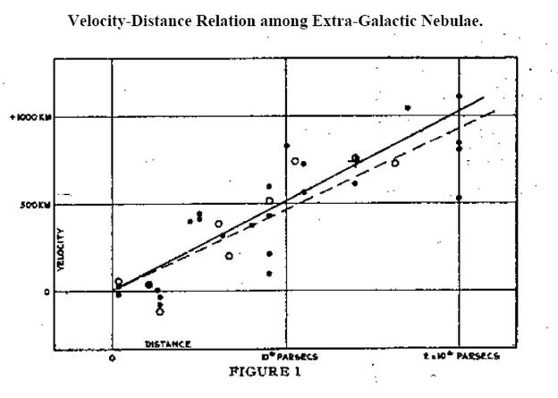 1929年,美国天文学家哈勃通过观测发现,离地球较远的星系,就会以更快的速度远离地球。远离的速度(也就是“退行速度”)大致和星系和地球的距离成正比。我们可以想象,在一个膨胀的气球上的相邻点,也是距离越远,相对速度越大。于是,哈勃的观测结果,意味着宇宙在膨胀中,这就开启了宇宙学的新时代。粗略的说,哈勃利用了一种变星已知的发光强度,跟在地球上接收到的光强比对,来测量星系到地球的距离。而星系相对于我们的速度,哈勃是利用星系的发射光谱相对于地球上同样元素的光谱往波长更长方向的多普勒移动测出。