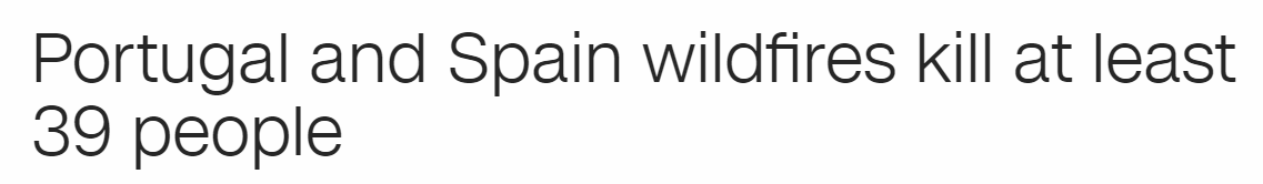 【葡萄牙西班牙森林大火至少39死】周一西班牙和葡萄牙两国政府称至少39人在森林大火中丧生。葡萄牙境内发生的150场大火已致36人死亡,至少63人受伤,其中16人伤势严重,还有数人状态。4000多消防人员正在投入救火行动。葡萄牙首相周一在紧急声明中称火灾是“灾难性的”,要求投入一切手段进行灭火和救援。声明同时称周二开始葡萄牙进行为期三天的全国哀悼。
